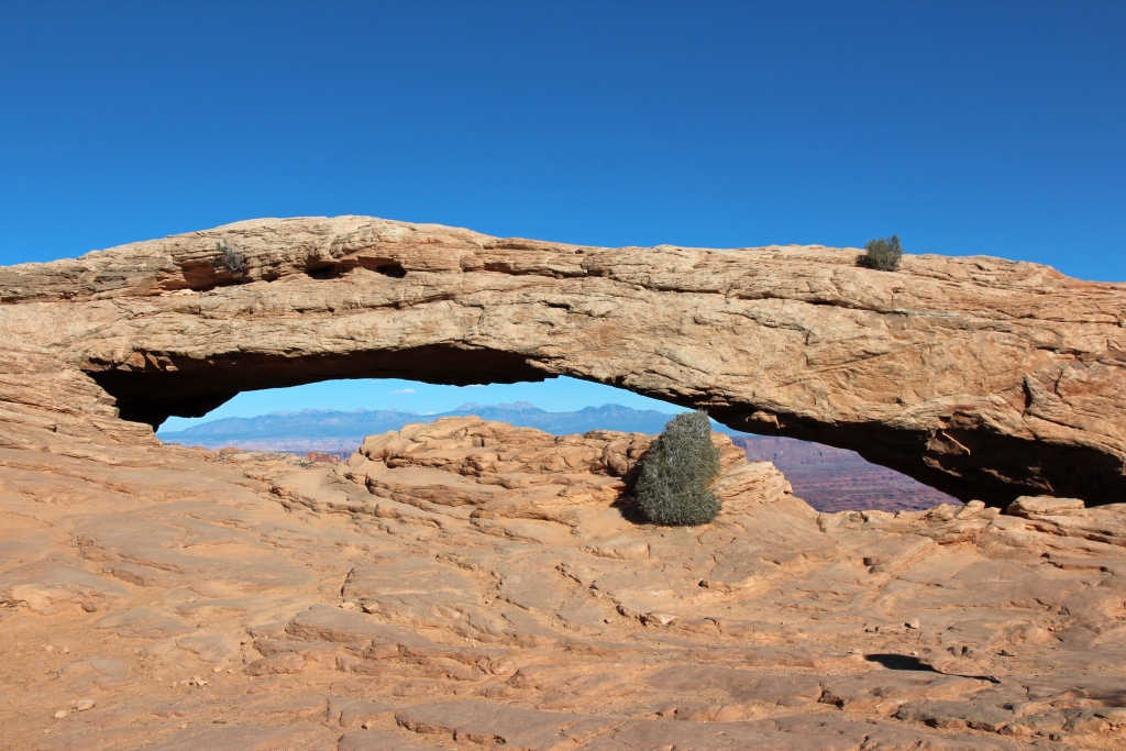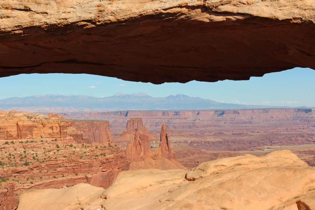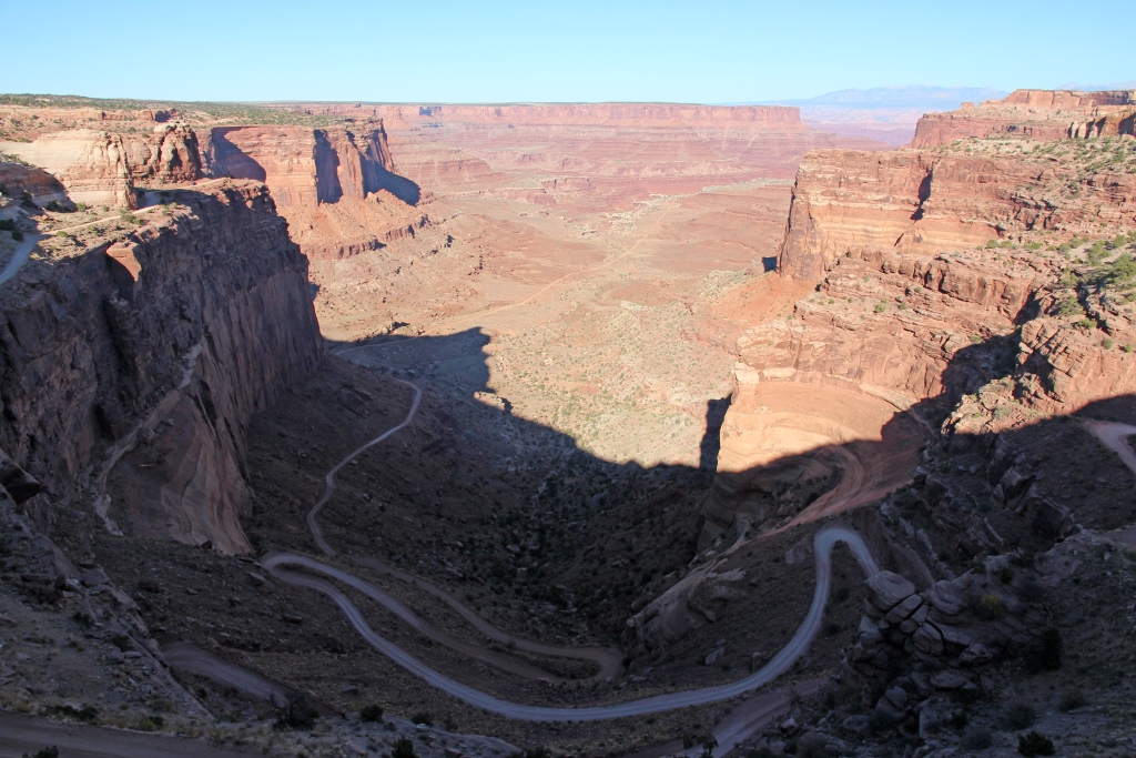 Beim Mesa Arch dagegen muß gelaufen werden. Es sind ja auch nur wenige hundert Meter. Hier herrscht auch jetzt am Nachmittag Hochbetrieb. Jeder meint, mit dem Bogen fotografiert werden zu müssen, so daß es gar nicht so einfach ist, den Bogen "ungestört" aufzunehmen. Zwei Ausblicke auf den Shafer Canyon und die zugehörige Straße müssen auch noch sein. Auf dem Shafer Trail herrscht ein reger Verkehr – mehr als auf mancher Interstate.