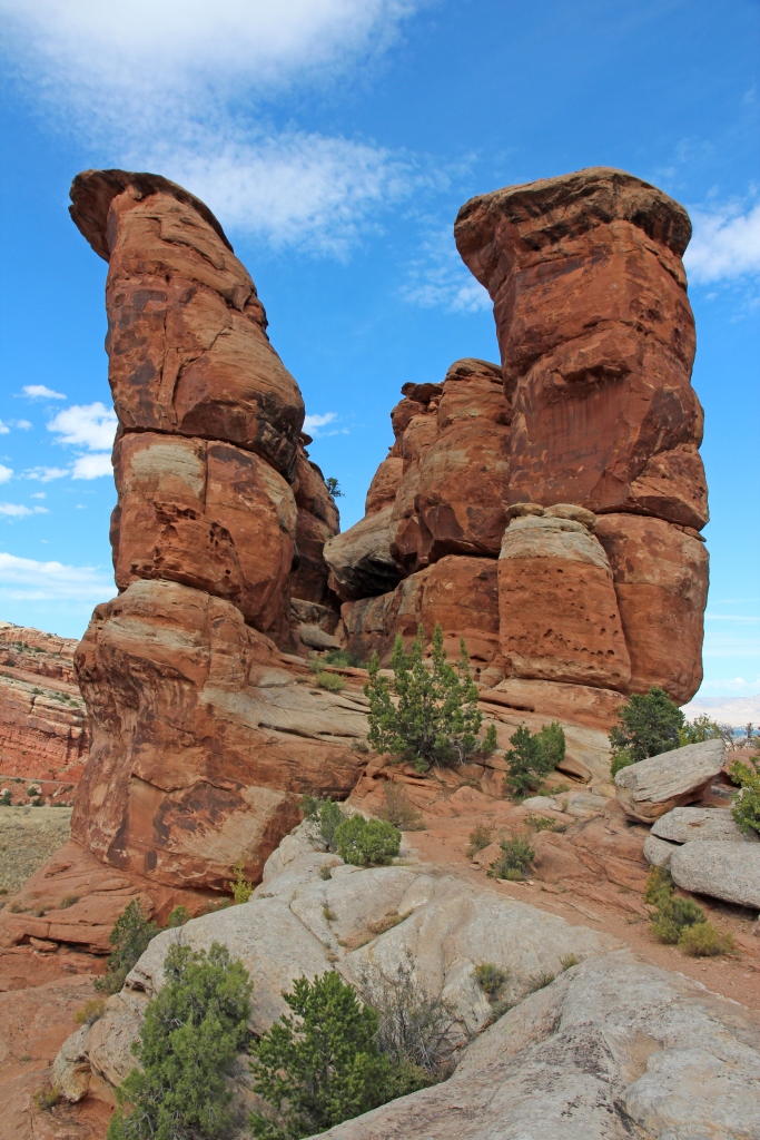Am Devils Kitchen Picknickplatz nehmen wir unser Mittagessen mit Crackern, Käse und Joghurt zu uns. Dann marschieren wir den Weg zu Devils Kitchen. Anfangs geht es ganz sanft los, dann kommen etliche Stufen und dann geht es mehr oder weniger weglos den Slickrock hinauf. Es gibt zwar immer wieder Cairns, aber eine wirklich eindeutige Wegführung läßt sich ihnen nicht entnehmen.