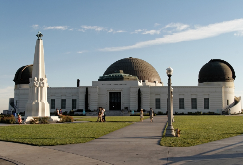 Den Weg zum Griffith Observatorium verhunzt das Navi ziemlich; erst mit einigen Umwegen (anstatt oben zu bleiben), kommen wir dorthin. Erst müssen wir einmal ein wenig herumkurven, weil oben alle Parkplätze belegt sind. Zwar fährt einer raus, aber der war mit seinem japanischen Kleinwagen gerade so in die Lücke gekommen - nichts für uns. An der Straße nach unten finden wir dann einen Platz in nicht allzu weiter Entfernung und kämpfen uns zu Fuß entlang der Straße hoch. Oben empfängt uns das imposante Gebäude mit seiner umlaufenden Terrasse. Wir genießen den Ausblick auf die unendlich weite Stadt. Leider ist die Sicht durch eine Dunstschicht getrübt.
