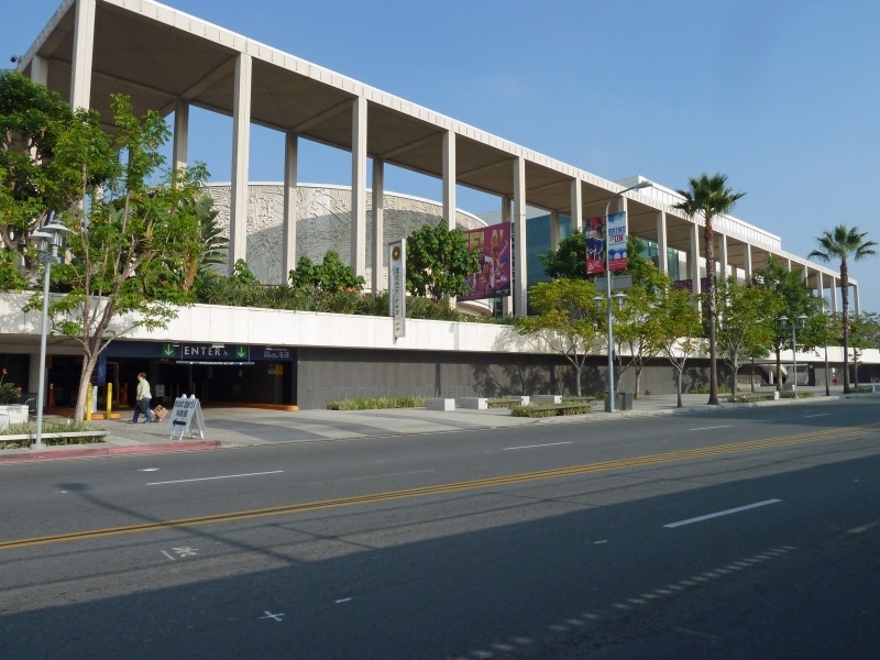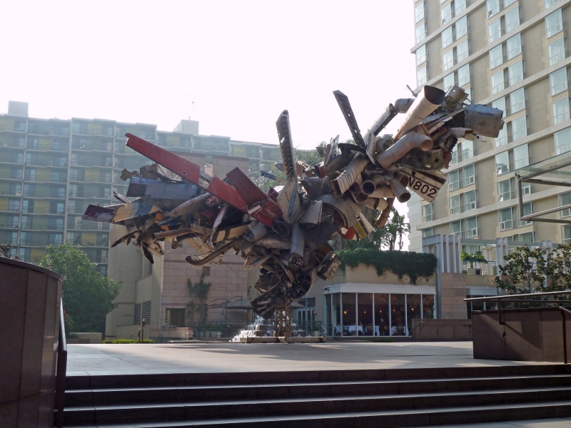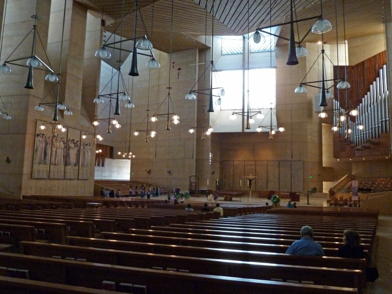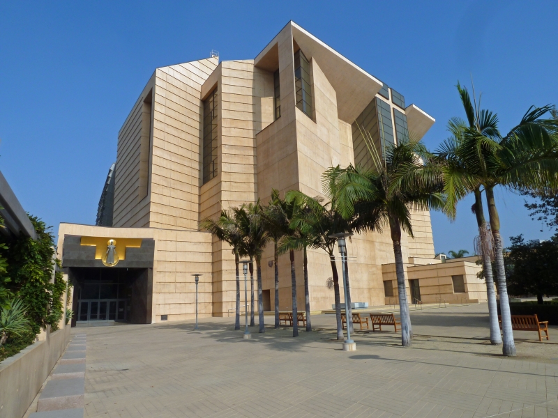 Wir wollen das Zimmer möglichst lange behalten und begeben uns daher zunächst auf Wanderschaft. Zunächst kommen wir am Museum of Contemporary Art vorbei, das wir aber nicht besuchen. Wir begnügen uns mit einem Blick auf Brunnen und Plastiken im Freien. Anschließend gehen wir an der Walt Disney Concert Hall vorbei, wo wir und ein Musiker aus München uns gegenseitig ablichten. An einer weiteren Konzerthalle vorbei erreichen wir die Kathedrale – von außen wie von innen ein Ausbund von Scheußlichkeit.