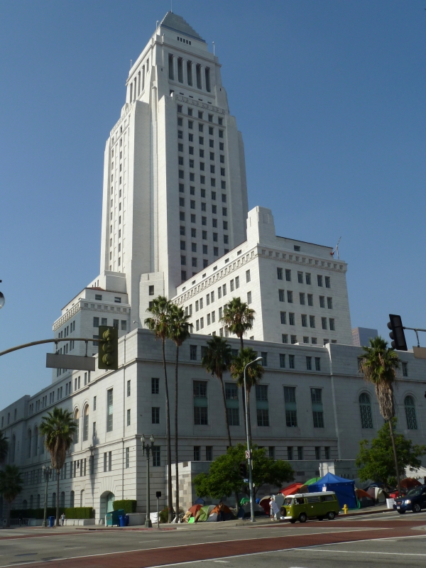 Wir passieren einige Gerichtsgebäude, kommen an der City Hall vorbei, vor der sich ein Zeltlager von Occupy-Demonstranten entwickelt hat, überqueren die 101 und erreichen den  Pueblo Los Angeles; begrüßt werden wir aber zunächst vom Brunswig Building. Bevor wir die Olivera Street erreichen, kommen wir nochmals an einer diesmal etwas schöneren und kleineren Kirche vorbei, wo offenbar gerade eine Erstkommunionsfeier stattfindet. Alle sind ganz prachtvoll herausgeputzt.