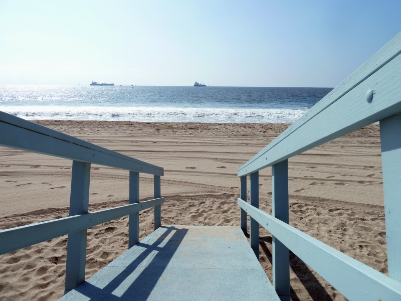 Als nächstes Ziel hatte ich den Baldwin Hills Scenic Overlook ausgesucht, zumal der ziemlich direkt auf dem Weg zum Flughafen liegt. Dort meinten wir, etwas gucken und herumlungern zu können. Daraus wird aber nichts: 6 USD Parkgebühr für den Blick in den Dunst (von der Stadt war nicht allzu viel erkennbar) und ohne jeden Schatten war uns dann doch zuviel. Also fahren wir wieder runter, stellen uns an den Straßenrand und versuchen per Navi einen Strandabschnitt in Flughafennähe zu finden (erstens will ich nicht mehr allzu viel herumfahren und zweitens möchte ich auch nicht nochmals tanken). Für eine Suche per Landkarte erweist sich das Garmin allerdings als ziemlich ungeeignet. Nach viel Flucherei habe ich einen Punkt markiert und es geht los, am Flughafen vorbei und direkt Richtung Meer zur Vista del Mar. Etwa eine halbe Meile südlich ist eine Ausfahrt zu einem Parkplatz am Dockweiler State Beach, die wir gleich nehmen. Dort kostet es gleich 8 USD, dafür gibt es aber Strand und Meer und frische Luft. Erst der zweite Automat nimmt meine Dollarscheine entgegen.