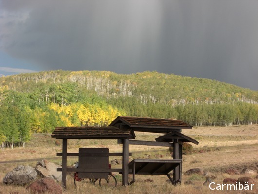 Wir sind dann als erstes nach Canonville  ins Visitor Center gefahren, um uns über den Straßenzustand der Cottonwoodroad zu erkundigen. Dort meinte der Ranger, dass man sie mit High Clearence fahren könnte, aber es könnte durchaus sein, dass es wegen den gestrigen Gewittern am Anfang zu Sturmschäden gekommen ist und die letzten 14 Meilen seien extrem schlecht. Genaueres wusste er auch nicht, denn es ist wohl seit gestern dort keiner von den Rangern lang gekommen. Und wenn, sollten wir gleich aufbrechen, denn heute Nachmittag sollte es erneut zu Regenfällen kommen. Wir sind dann zum Kodachrome Basin State Park gefahren und haben auch schon entschieden, dass wir die Cottonwoodroad auf unseren nächsten Besuch verschieben. Denn die dunklen Wolken waren schon zu sehen und wir wollten nicht riskieren nicht am Zion N.P. anzukommen.