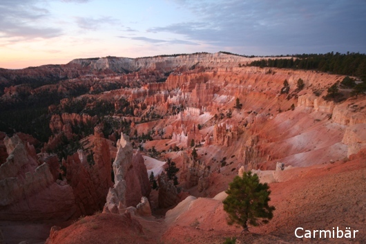 Dann sind wir noch zum Bryce Point gefahren um von dort noch ein paar Bilder zu machen. Wir wollten doch unser Wohnzimmerbild von vor drei Jahren gegen ein neues austauschen. Leider war das Licht nicht so toll, weil sich wieder einige Wolken vor die Sonne geschoben haben. Die tolle rote Farbe der Steine kam nicht wirklich zur Geltung. Wir haben hier sogar einen in kurzer Hose und T-Shirt getroffen. Carmen hat ja in ihrer langen Jeans und der Fleecejacke noch gefroren. Das war echt abartig. Und Badelatschen hatte der auch noch an. Das ist mir ja sogar zu kalt, dass ich ohne T-Shirt rumlaufen würde.