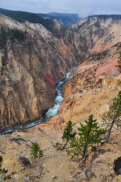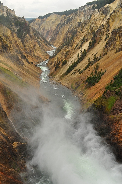 Bald flüchten wir wieder ins Auto und fahren Richtung Canyon Village. Das Wetter wird langsam etwas besser und wir beschließen wie geplant den Grand Canyon of the Yellowstone zu besichtigen. Es ist weiterhin bewölkt, aber mit Regen war es das für heute und die Sonne kann sich im Verlauf des Tages immer besser durchsetzen. Wir machen das Standardprogramm: North Rim mit Brink of the Lower Falls, Red Rock Point und allen anderen Viewpoints. Die Hikes sind nicht sonderlich schwer aber lohnen sich total. Zwischen den beiden Rims gibt es eine eigene Zufahrt zum Brink of the Upper Falls. Auch das sollte man sich nicht entgehen lassen. Wie die Wassermassen in die Tiefe stürzen ist faszinierend. Weiter geht’s Richtung South Rim. Dort machen wir Uncle Toms Trail. Die Stiegen sind nicht unanstrengend, aber der Blick auf die Lower Falls ist es allemal wert. Unser Sightseeing Programm endet mit dem Artist Point. Auch ohne längere Hikes haben wir einige Stunden am Canyon verbracht.