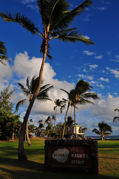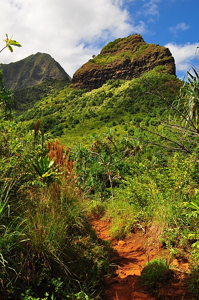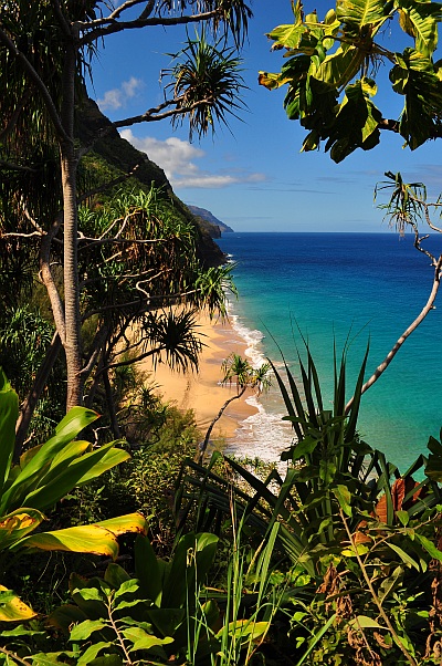 Die Straßen werden immer schmäler und die Vegetation wird dichter. Es gibt viele One Lane Bridges und die Strecke ist recht kurvig, zumindest für amerikanische Verhältnisse. Bis wir einen Parkplatz gefunden haben (der Parkplatz am Ke’e Beach ist immer sehr früh voll) sind fast eineinhalb Stunden seit der Abfahrt vom Hotel vergangen. Das Wetter scheint sich jetzt zu bessern und wir beginnen den Kalalau Trail. Schlammig ist er schon ein bisschen, aber bei weitem nicht so wild wie der Pihea Vista gestern. Alles in allem gut zu gehen, aber bei den warmen Temperaturen nicht unanstrengend. Wir gehen sehr langsam, oft muss man Leute überholen oder überholen lassen, es herrscht nämlich reger Verkehr. Die Ausblicke über die Küste werden immer bombastischer und als wir den Hanakapi'ai Beach von oben sehen denke ich mir endgültig, dass ich im Paradies angekommen bin. Eingekesselt von Bergen liegt dieser Traumstrand in Mitten der puren Natur. Keine Hotels, Autos oder sonstiges. Herrlich. Wir picknicken am Strand und genießen die tolle Atmosphäre. Baden ist hier leider zu gefährlich. Schon unzählige Menschen wurden von den Fluten getötet, auch wenn man dies bei dem heutigen Wellengang gar nicht glauben kann.
