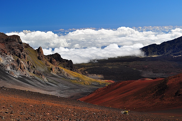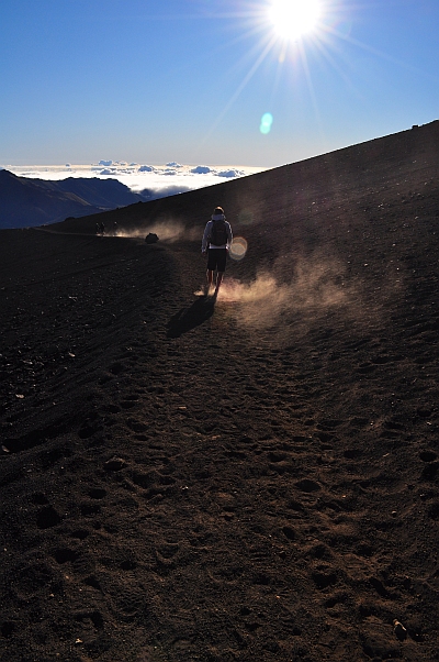 Im Anschluss wollen wir gleich den Sliding Sands Trail machen. Zwar herrscht am Beginn Gegenlicht, nur wenn das Wetter einmal passt, sollte man nicht lang zögern und mit dem Trail nicht auf den Nachmittag warten. Nebel kann immer aufkommen. Wir wollen nur bis zum Ka Lu'u o ka O'o Crater, aber der Trail ist nicht einfach. Es ist heiß, sandig und wir sind heute eindeutig übernachtig und nicht ganz fit. So kommt es, dass wir für den Trail mit einigen Pausen 3 Stunden benötigen. Um 10 sind wir wieder am Visitor Center. Aber sonst war der Trail sehr schön und etwas ganz anderes als die anderen Trails.