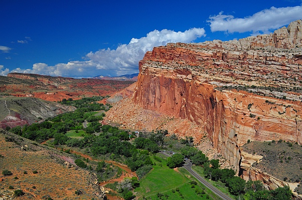 Nächster Halt ist nun endgültig das Visitor Center. Und wie befürchtet die Hiobsbotschaft. Die Flussdurchquerung zum Cathedral Valley ist gesperrt. Der Wasserstand ist zu hoch. Auch die One Way Fahrt von Caineville wird uns nicht empfohlen: Wir haben keinen 4 Wheel Drive, es besteht Regengefahr und die Straße soll in schlechtem Zustand sein. So, erst einmal wieder Fustration. Dann kommt mir allerdings die Idee, den Strike Valley Overlook nachzuholen. Anfahrt über die Nottom Bullfrog Road. Die Rangerin meint es sein gut machbar. Also los. Aber halt. Die erste Wanderung im Capitol Reef hat uns so gut gefallen, dass wir noch schnell einen weiteren Hike machen wollen, bevor wir uns auf die Nottom Road begeben. Das Wetter hat jetzt auch aufgeklart. Also ab in den Cohab Canyon.