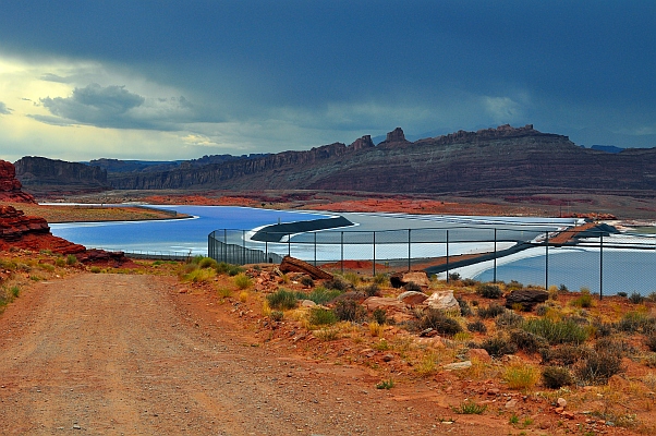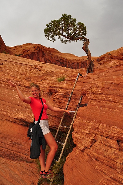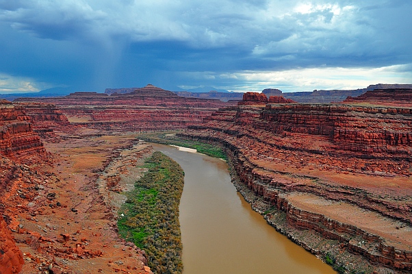 Das soll noch eine Straße sein? Unzählige Felsen auf der Straße, brutale Steinstufen, das Flussbett ist zeitweise unsere Straße oder sie besteht überhaupt nur aus einem glatten Felsen. 2 mal sitzen wir auf und müssen bergauf zurücksetzen. Meist muss Marie aussteigen und mir einen Weg bahnen, damit ich nicht den Unterbau des Autos ruiniere. 4 Wheel Drive braucht man bergab wirklich nicht, man kann ja nirgends stecken bleiben. Man muss allerdings aufpassen nicht von einem fiesen Stein aufgespiest zu werden. Meist können wir gerade Schritttempo fahren oder müssen halten und die beste Stelle zum drüberfahren suchen. Mit einem versicherten High Clearance Auto ist das sicher ein Spaß. Aber mit unserem Kia ohne Versicherung schwitzen wir jetzt gigantisch. Reserverad haben wir auch keines dabei. Wir verfluchen den Ranger. Das ist nun wirklich keine Piste für Offroad Anfänger. Irgendwie schaffen wir es nach einer halben Ewigkeit zum Viewpoint über dem Colorado. Marie ist panisch und auch meine Pumpe überschlägt sich fast. Das Lenkrad ist schweißnaß. Hier pausieren wir erst einmal. Ein geführte Offroad Tour kommt uns entgegen. Der Fahrer meint, wir hätten das Schlimmste überstanden. Ich kann mich langsam entspannen und die tolle Landschaft genießen. Doch ein Blick zum Himmel macht mich nicht ruhiger. Schwarze Regenwolke umzingeln uns. Also schnell wieder ins Auto und weiter. Die Piste ist jetzt tatsächlich besser fahrbar, allerdings noch immer kann man nicht schnell fahren. Als wir die Potash Becken erreichen regnet es bereits ziemlich stark. Ich wünsche mir wirklich nur mehr, von der Straße runterzukommen. Nach unendlichen 1.45 Stunden sind wir dann am asphaltierten Teil der Straße angekommen. Zuvor kommt uns noch ein Wohnmobil entgegen, das tatsächlich auf der Dirt Road fährt. Resume: Die Strecke mag für erfahrene Fahrer mit ein paar finanziellen Rücklagen sehr amüsant sein, aber für uns war das zuviel. Kann ich keinem off Road Anfänger mit Mietwagen empfehlen.