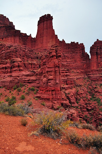 Unser Tagesziel ist Grand Junction. Wir wollen dorthin auf der 128 gelangen. Ich habe mir vorgestellt an im Abendlicht glühenden Felsen entlangzufahren. Aber leider ist alles trostlos finster. Gerade dass es nicht regnet. Ich bin niedergeschlagen. Die Fisher Towers werden wohl kein gutes Fotomotiv abgeben. Tatsächlich gibt es heute nicht mehr die geringste Chance auf Sonne, so fahren wir nur durch das Castle Valley und machen einen kurzen Stopp bei den Fisher Towers. Dann geht es direkt nach Grand Junction. Bald wird es finster und beginnt stark zu regnen. Die restliche Fahrt von einer Stunde ist dadurch kein Vergnügen. Wir sind erleichtert, als wir das Marriott in Grand Junction erreichen und uns ins Zimmer verziehen können.