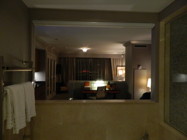 Unser Zimmer war im 38. Stock, der absolute Wahnsinn. Hier das Bad mit Durchbruch, so dass man aus dem Fenster auf den Strip schauen kann.