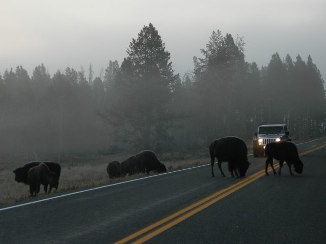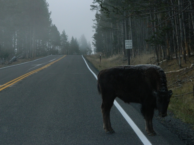 Wir fuhren durch völlige Dunkelheit, als wir von weitem plötzlich Blaulicht sahen. Was war da wohl los?! Wir wurden langsamer und plötzlich musste ich eine Vollbremsung machen, weil ein ausgewachsener Bison direkt vor uns auf die Straße sprang. :bibber: