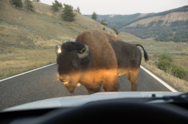 Wir fuhren durch völlige Dunkelheit, als wir von weitem plötzlich Blaulicht sahen. Was war da wohl los?! Wir wurden langsamer und plötzlich musste ich eine Vollbremsung machen, weil ein ausgewachsener Bison direkt vor uns auf die Straße sprang. :bibber: