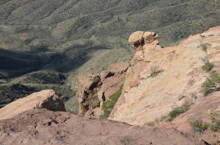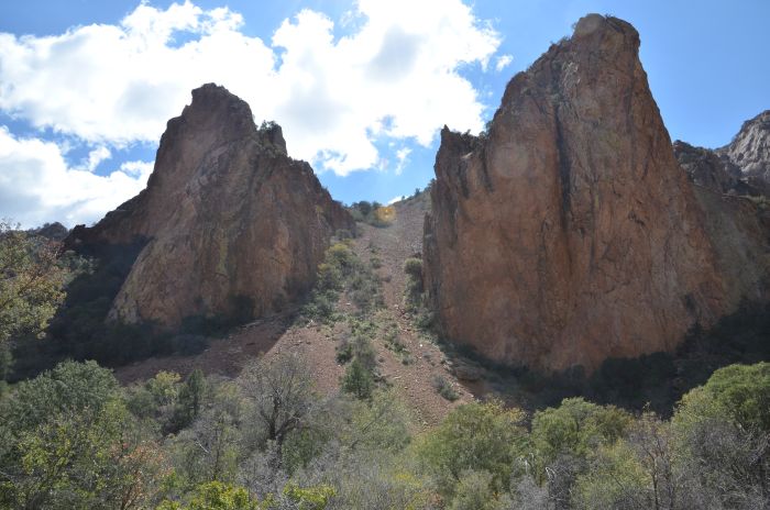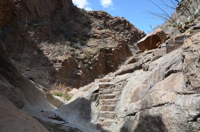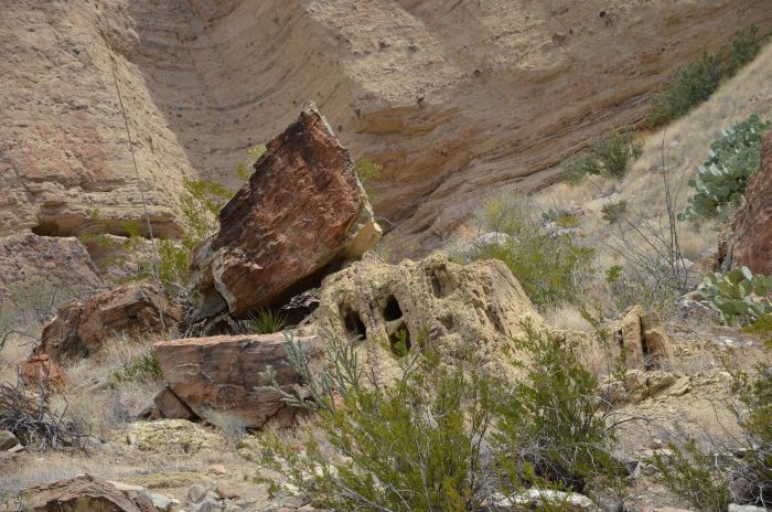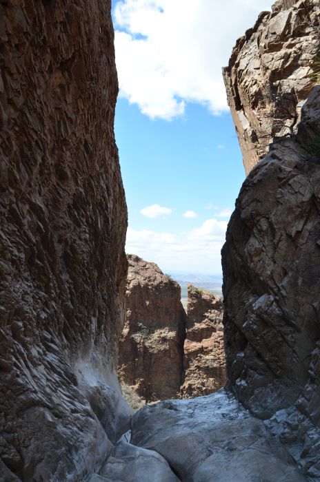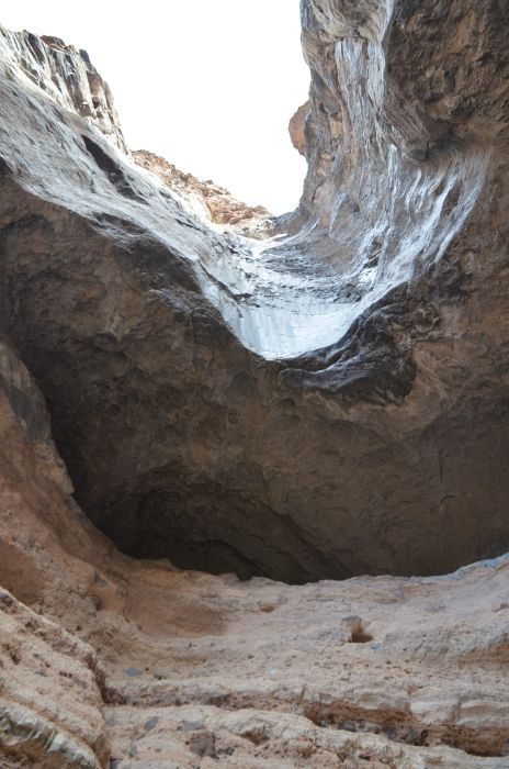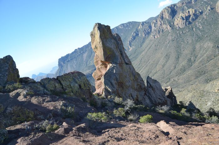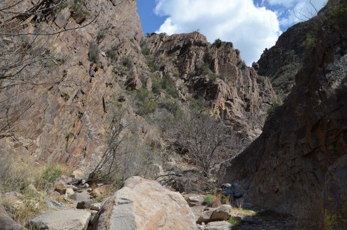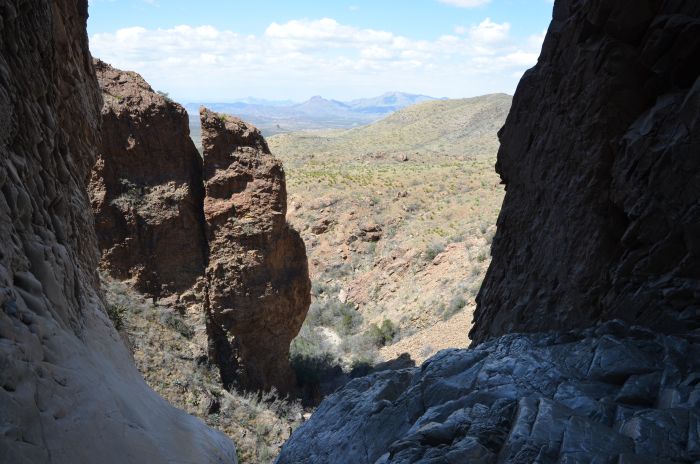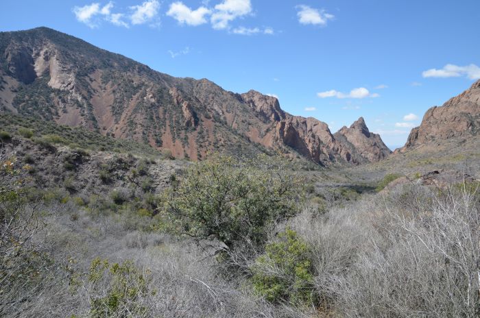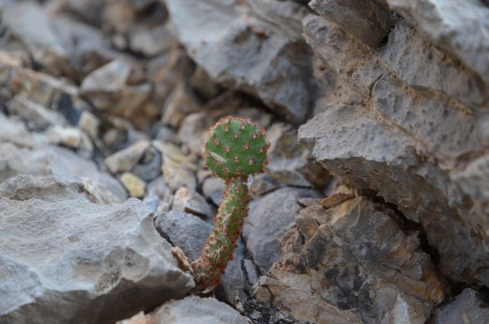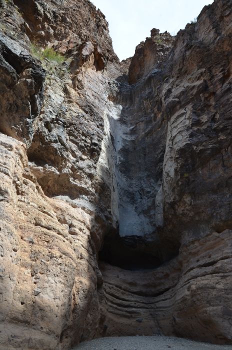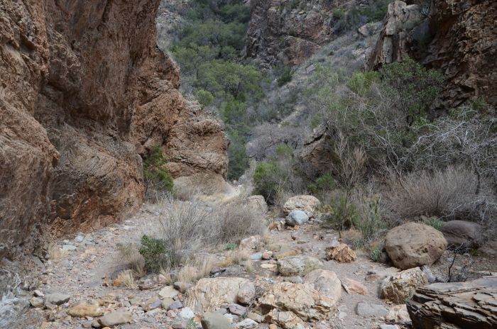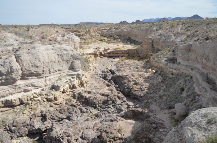Weiter geht es dann Richtung Castolon zum ersten Visitor Center und von dort über den Ross Maxwell Scenic Drive wieder nach Norden. Am Tuff Canyon und Mule Ears View Point beschränken wir uns auf die Aussichtspunkte und lassen die Trails aus. Dafür laufen wir den halbstündigen Trail zum Burro Mesa Pouroff, einem gewaltigen Einschnitt im Fels in dem bei Regen die Wassermassen herabstürzen und einen breiten Creek bilden. Wie gesagt: Alles trocken.