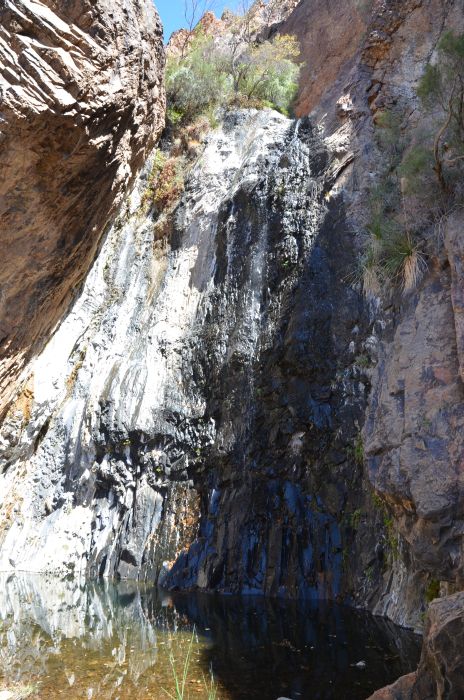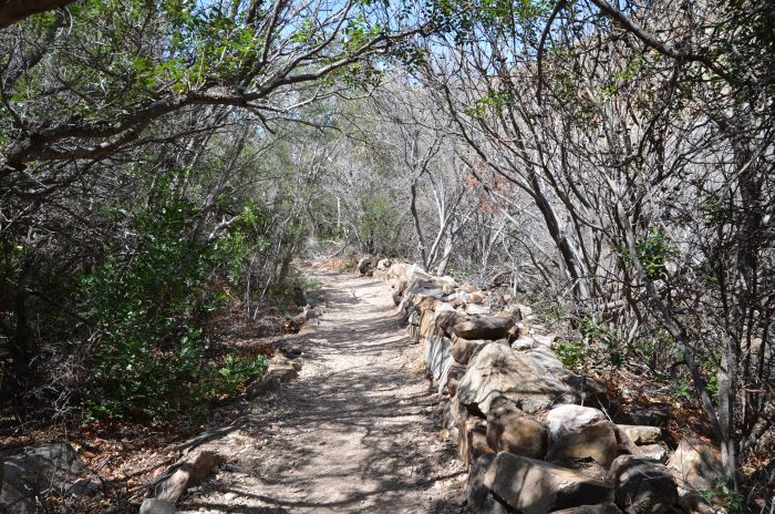 Die Reste der Homer Wilson Ranch und der Sam Nail Ranch schauen wir uns auch kurz an – biegen dann aber gegenüber vom Parkplatz für die Sam Nail Ranch in eine ungekennzeichnete Gravel Road ab, die uns nach einigen gerüttelten Minuten zu einem Parkplatz führt von dem der Trail zu den Cattail Falls abgeht. Dieser Trail ist in den offiziellen Karten nirgendwo erwähnt, da der Wasserfall am Ende der Wanderung auch in trockensten Zeiten Wasser führt und sich dort ein empfindliches Ökosystem gebildet hat. Die Ranger geben erst auf gezielte Nachfrage Infos preis. Dafür ist die Wanderung sehr schön, führt erst durch offene Wüstenlandschaft und dann in den Cattail Canyon hinein. Am Ende muss man über ein paar Steine kraxeln und steht dann am Fuß der Cattail Falls, die tatsächlich Wasser führen. Wenn auch sehr wenig. Hin- und zurück sind wir zwei Stunden unterwegs.