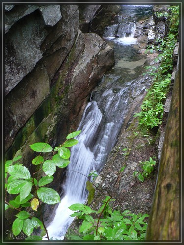 Nach einem Vergleich mit den Alpen, geht Martin wieder seinen fotografischen Ambitionen nach. Er klettert auf den Steinen rum um näher an die kleinen Wasserabgänge zu kommen und versucht diese künstlerisch zu fotografieren. Mir soll’s recht sein, so lange er auf die Kamera aufpasst, die bis zum Objektiv in einer Zipper Tüte steckt. Selbst klettere ich ihm nicht nach. Irgendwie schaut das hier alles so rutschig aus und bevor ich dann doch im Bachbett lande lasse ich es lieber. Nachdem Martin sich ausgetobt hat geht es weiter. Es gibt einige Trails zu verschiedenen Wasserfällen, aber da es immer noch regnet, entscheiden wir uns für den, der scheinbar ziemlich nahe zur Straße ist. Daher haben gewonnen: Die Sabbady Falls. Wir parken unseren PT Cruiser und machen uns auf, auf den, zugegebener Weise, kurzen Weg zu den Falls.
