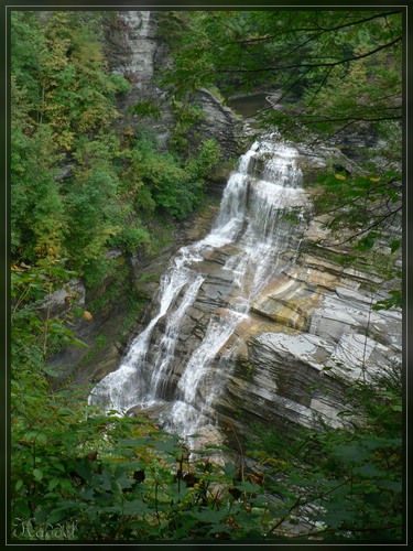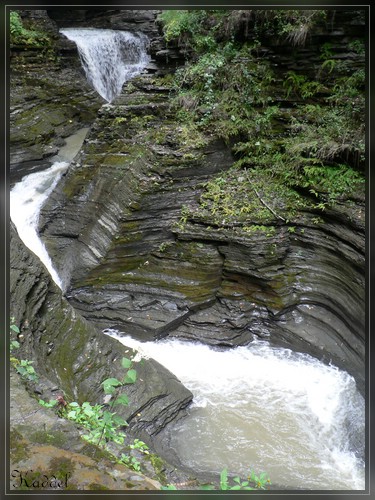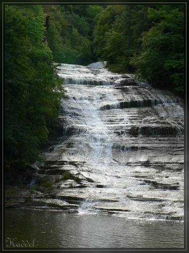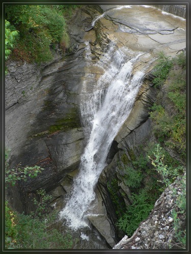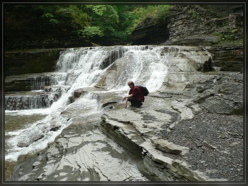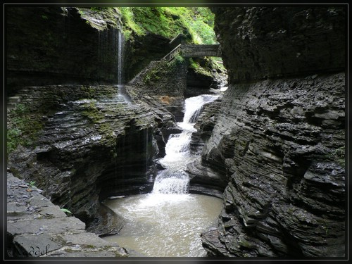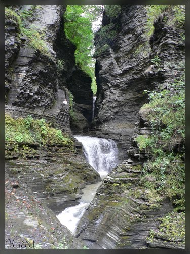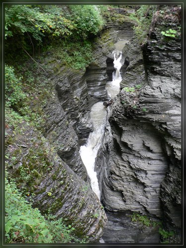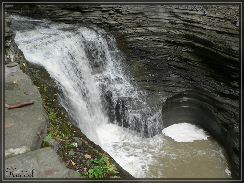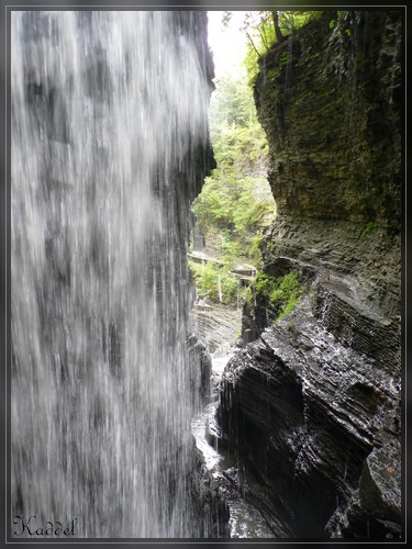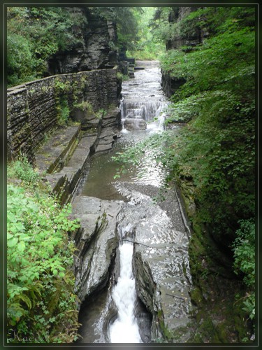 Durch ein Tor und einen Tunnel geht es los zu lauter kleineren und größeren Wasserfällen. Wie schon im Robert H. Treman State Park, sind auch hier die Steinschichten ganz dünn. Die Schlucht ist wesentlich enger und so spritzt das Wasser durch engere Stellen. Der Weg ist schön angelegt mit einer Treppe die in die Steine eingelassen ist.