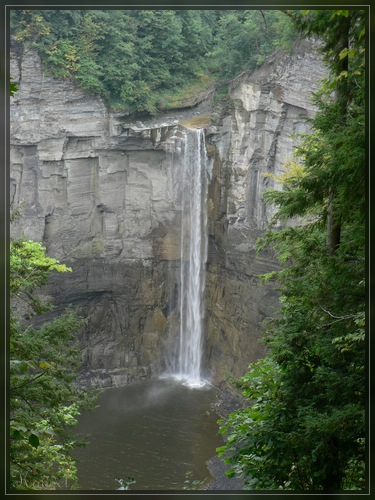 Ein bisschen gerädert von der letzten Nacht, stehen wir erst nach 9:00 Uhr auf. Von den Jugendlichen am benachbarten Campsite sieht man nicht viel. Einer sitzt halb komatös auf der Bank, sonst ist keiner zu sehen. Nur Überreste vom Partymüll. Ein Squirell hängt bis zum Schwanz in einer Tortilla Tüte. Im großen und ganzen ein sehr idyllische Bild  :wink: ! Wir Frühstücken nur eine Kleinigkeit und machen uns dann auf den Weg. Ab ins Auto und los Richtung Taughannock Falls State Park, der nur knapp 10 Meilen entfernt ist. Wir fahren also das kleine Stück an der West Seite des Cayuga Lakes entlang und sind schon bald am Ziel.