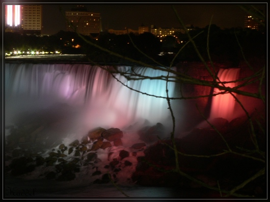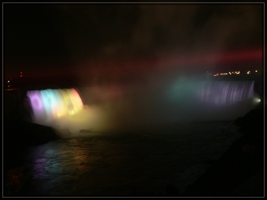 Nachdem wir wieder trocken sind und es schon gegen 19 Uhr ist suchen wir uns etwas zu essen. Die Wahl fällt auf einen kleinen Mexikaner. Nichts besonderes aber preiswert. Danach ist es noch nicht richtig dunkel. Da wir die Fälle auch beleuchtet sehen wollen beschließen wir erst noch ins 3D Kino zu gehen. Die Qualität ist nicht die Beste, aber der Film über die Falls ist schön gemacht und informativ. Man erfährt ein bisschen was über die Indianer, über die Verrückten die sich in Fässern die Fälle runterstürzten, über die Hochseilaktionen, aber auch über einen Jungen, der nur mit einer Rettungsweste, den Sturz die Fälle hinunter überlebte. Nach dem Film kann man sich noch diverse dieser Fässer anschauen und natürlich einige Souvenirs ergattern. Wir widerstehen der Versuchung und laufen zu den Fällen um sie auch beleuchtet zu betrachten. Auf einer Seite vielleicht kitschig, auf anderer Seite einfach nur nett. Nett auch die Leute die mit ihrer Schnappschusskamera und mit Blitz versuchen diese zu fotografieren. Unsere Fotos sind vielleicht auch nicht der Hit und unsere Kamera ist sicher nicht die Beste, aber wir haben es wenigstens mit Stativ und ohne Blitz versucht.