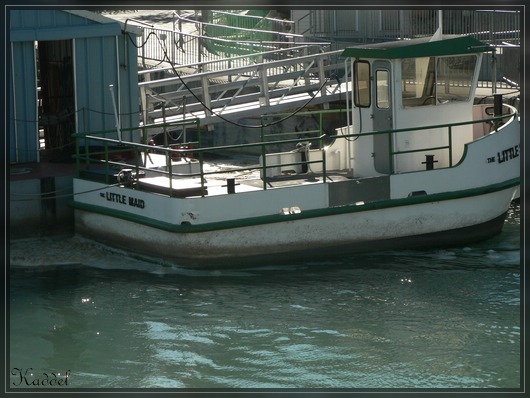 Es legt an und die Passagiere verlassen mehr oder weniger nass das Schiff. Dann sind wir an der Reihe. Es ist die letzte Maid of the Mist die heute ablegt und sie ist lang nicht voll. Wir bleiben auf dem unteren Deck und stehen ganz vorne. Unsere Kamera haben wir in eine Zip Tüte gesteckt so das nur das Objektiv rausschaut und wir hoffen, dass sie diese Fahrt überlebt. Wir legen ab und Martin fängt schon Mal ein paar Bilder von den American Falls ein und außerdem von der Little Maid.