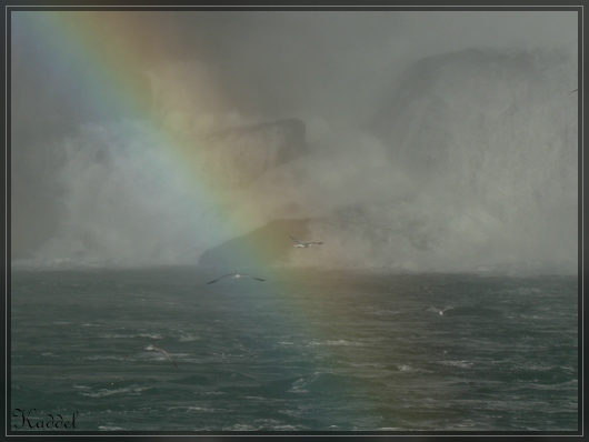 Ja und dann macht sich die Spannung breit und es geht immer Näher an die Falls. Das Schiff beginnt immer mehr zu Schaukeln und auch die Wellen schlagen höher. Das Rauschen wird immer lauter bis es nur noch ein Donnern ist. Umso näher man kommt umso mehr muss man sich festhalten und Martin hält die Kamera einfach hin und drückt auf gut Glück ab. Das Wasser spritz immer mehr über die Reling und ja, die Duschaktion war völlig umsonst, denn nun gibts die Dusche für Umsonst. Bald lässt sich das Schiff wieder zurückfallen und es geht zurück. Die Regencaps haben nicht wirklich viel gebracht, bei Martin ist das Wasser die ganze Zeit vorne reingelaufen und sein T-Shirt ist auf dem Brustkorb komplett nass. Dennoch haben wir auch hier ein paar nette Fotos gemacht.