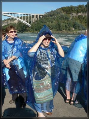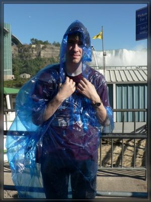 Schließlich checken wir um kurz nach 15 Uhr für 75 kanadische Dollar im Fallsview Inn ein. Da es kein Queensize Bett Zimmer mehr gibt, kriegen wir halt eins mit zwei Betten drin und die Dame am Empfang erzählt uns, dass sie ihre Flitterwochen ja in Deutschland verbracht hat, immerhin zwei Tage war sie dort, bevor es nach Frankreich weiterging. Unser Zimmer ist schön und ich teste erst Mal die Dusche, da ich mich nach den Zelttagen voll dreckig fühle. Frisch geduscht und geschminkt, dass diese Aktion so gut wie Umsonst war muss ich ja nicht sagen, gehts dann los zu den Fällen. Bereits auf der Straße dorthin, haben wir das Gefühl, dass die Gischt vom Wind bis hier hoch getragen wird. Da das letzte Boot der Maid of the Mist um 16:30 fährt, machen wir uns langsam aber sicher auf den Weg zur Anlegestelle, denn es ist schon kurz vor 16:00. Wir zahlen unseren Beitrag und dann geht es mit dem Aufzug runter zur Anlegestelle. Wir erhalten unsere blauen Regencaps und sind gerüstet für die Fahrt.