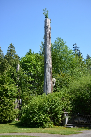 Nach der Morgenwäsche setzen wir uns unten am Broadway ins Cafe und frühstücken mit Blick auf die Strasse. Menschen beobachten macht Spaß, vor allem wenn wir Urlaub bzw. keine Eile haben. Dann steigen wir in unser Schlachtschiff und fahren zu Vancouvers bevorzugtem Ausflugsziel, dem Stanley Park. Wir wollen ganz untypisch den Park erlaufen und nicht den Loop fahren. Das Wetter zeigt sich dafür auch von seiner guten Seite, leicht bewölkt und gerade schon T-Shirt geeignet. Wir ziehen uns Ticket fürs Parken und laufen Richtung Brockton Point. Von dort erhoffen wir uns eine schönen Blick auf die Skyline. Zunächst staunen wir aber aber über ein paar merkwürdige Bäume.