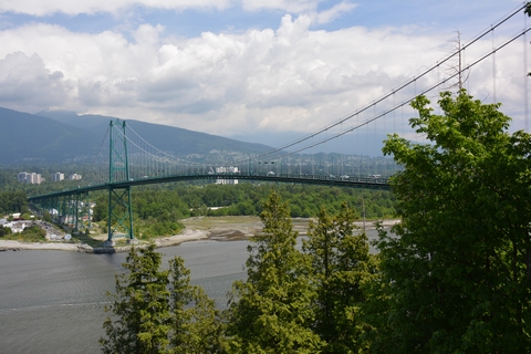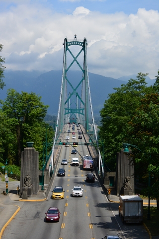 Die Sonne brutzelt inzwischen sogar richtig vom Himmel und wir sind froh, dass der Weg zum Prospect Point vom Ufer weg durch den Wald im Park führt. Wenn er nur nicht so einen Anstieg hätte.... Irgendwann überqueren wir dann die Strasse, die zu Lions Gate Bridge führt