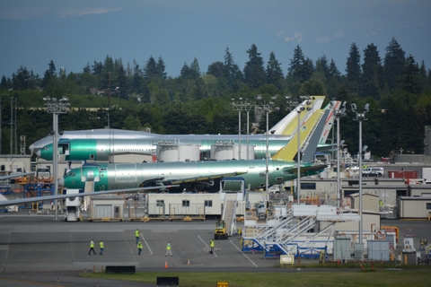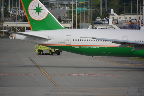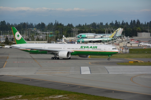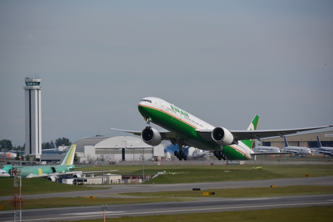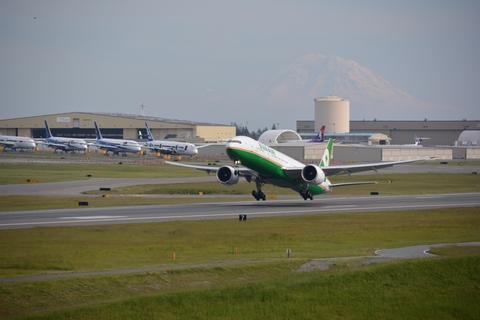 Im Vordergrund verläuft die Startbahn von Boeing und wir erleben den Start einer 777 der EVA AIR (Taiwan) auf ihrem Überführugsflug durch den Kunden.