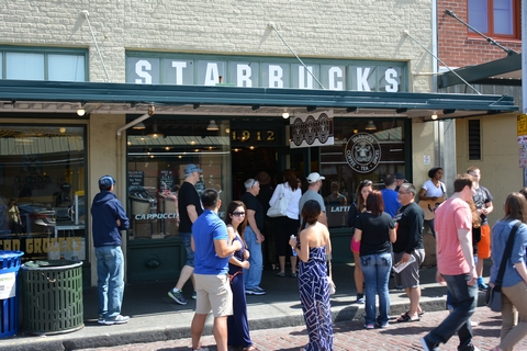 Die Menschenmenge hält sich glücklicherweise in  Grenzen, es gibt kein Gedränge. Als wir den Markt am anderen Ende verlassen, stehen wir vor unserem nächsten Ziel: Der 1. Starbucks. Natürlich müssen wir rein...
