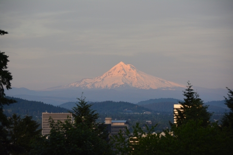 Um 19.40 lassen wir es gut sein und trotten zu unserem Wagen. Letztes Ziel ist der Washington Park, von dem wir uns einen schönen Sunset Blick via Downtown auf Mount Hood erhoffen. Den optimalen Punkt haben wir leider nicht gefunden, aber das Bild reicht für den Schlusspunkt heute
