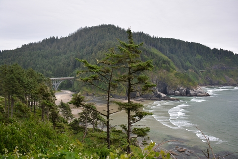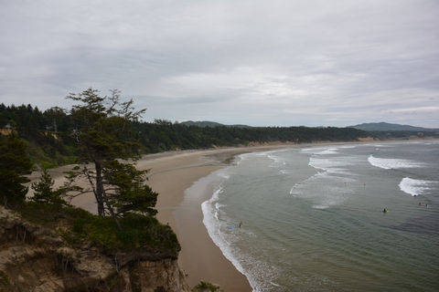 Der Wecker steht auf 7 Uhr. Als er klingelt sind wir schnell wach, auf die wilde Küste Oregons freuen wir uns sehr. Der Blick aus dem Fenster trübt unsere Vorfreude etwas, es ist bewölkt ohne ein Stück blauem Himmel. Nach dem überlaufenen Frühstück starten wir um 9:00 Uhr Richtung Westen. Die Fahrt über den Highway 6 dauert 90 Minuten, fast durchweg durch dichten Wald.