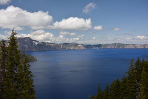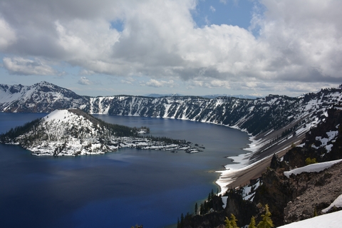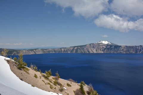 Im Visitor Center schauen wir uns den zugehörigen Film über die Entstehung und Bedeutung des Sees für Amerika an. Der Crater Lake ist der tiefste See in den Staaten. Er wird nur durch Regen und Schneeschmelze gespeist, hat keinen Zu- oder Abfluss. Deswegen ist er klar und sauber. Der East Rim Drive ist noch wegen Schnee gesperrt, also fahren wir den West Rim Drive lang. Der erste Blick lässt uns erstarren, dass blau ist unglaublich. Ich lasse mal die Bilder sprechen.