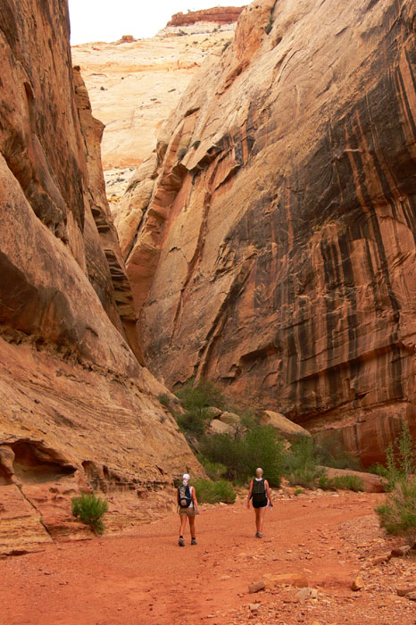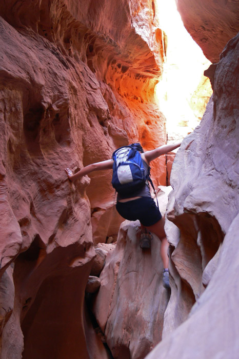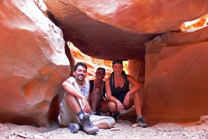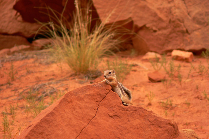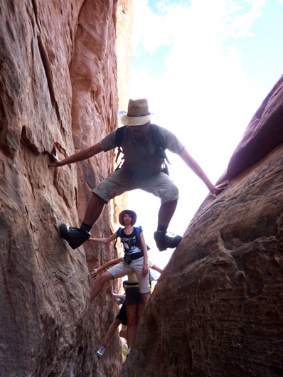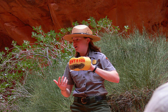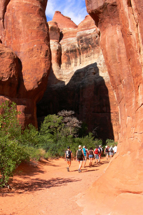 Am Parkplatz beim Trailhead für die Tour waren zwar schon einige Leute, aber wir waren bei Weitem nicht die letzten. Die Tour hat uns sehr gut gefallen. Man wird durch den labyrinthartigen Steingarten geführt, lernt einiges über die geologischen Besonderheiten die zur Entstehung der Felsformationen des Arches NP geführt haben, die Tierwelt z.B. auch in den Potholes sowie die mikrobiotische Kruste, über de ich vorher ja schon einiges gelesen hatte. Zudem konnte man ein wenig kraxeln und einem wurde gezeigt, wie man schmale Stellen, wo ein normales Laufen nicht möglich ist, am Besten überwindet.