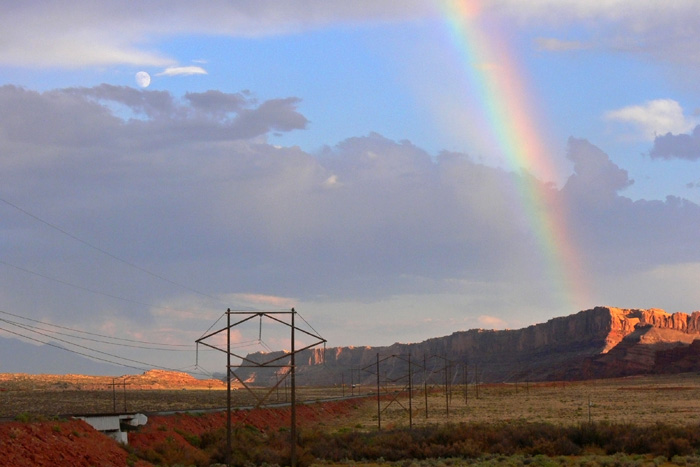 Alles in allem eine sehr empfehlenswerte Tour, gerade wenn man das erste Mal in der Gegend ist. Die Tour dauerte knapp drei Stunden, so dass wir uns beeilten, um den Sonnenuntergang beim Green River Overlook im Canyonlands NP nicht zu verpassen. Auf dem Rückweg wurden wir jedoch noch mit einem Regenbogen belohnt, der noch zu einem kurzen Fotostopp verleitete.