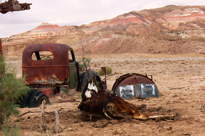 Ich gab Gray Jay also ne ordentliche Ladung vom 10W40, verschloss den Öltank (!) und wir machten uns auf den Weg nach Moab, um eine Autowerkstatt zu suchen. Die Ölstandsanzeige im Blick kurvten wir ein wenig durch die Stadt. Wir hatten leider vergessen, dass es Sonntag war, so dass es sich als schwieriger als gedacht herausstellte. Letztendlich fanden wir eine Werkstatt, die offen hatte und der Typ rief einen Kollegen an, der noch irgendwo unterwegs war. Er sagte uns, dass es einige Zeit dauern könne, da der Kollege erst noch was erledigen muss und dann was essen wird. Wir sollten in 2-3 Stunden wieder kommen, dann würde er wohl da sein. Da es bereits kurz vor 12 war, und ich nicht wusste wie umfangreich die Reparaturen sein würden, schreib ich unsere Fiery Furnace Tour schon mal geistig ab.