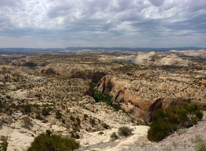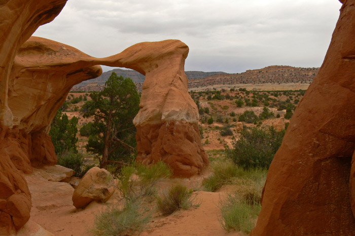 Da wir ja vernünftig sind, hieß es also mal wieder umplanen. :roll: Ich hatte noch diverse Ausweichwanderungen vorbereitet und wir entschieden uns für die Wanderung zu den Upper Calf Creek Falls. Da zudem nicht mit schönem Wetter zum Abend zu rechnen war und wir für die Reihenfolge Visitor Center – Upper Calf Creek Falls – Devils Garden – Campground zuviel hin- und hergefahren wären, besuchten wir zuerst den Devils Garden.