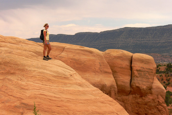 Der Zustand der Hole in the Rock Road war ausgesprochen gut, so dass man die Anfahrt, zumindest zu dem Zeitpunkt als wir da waren, auch problemlos mit einem normalen Auto gemeistert hätte. Als wir am Parkplatz ankamen verließ gerade eine amerikanische Familie den Picknickplatz am Devils Garden, so dass wir diesen ganz für uns hatten. Trotz des bedeckten Himmels hat es eine Menge Spaß gemacht ein wenig auf den Felsen rumzukraxeln.