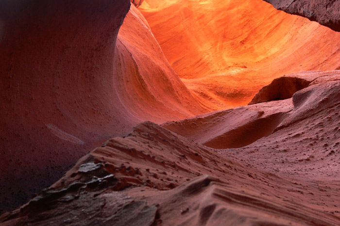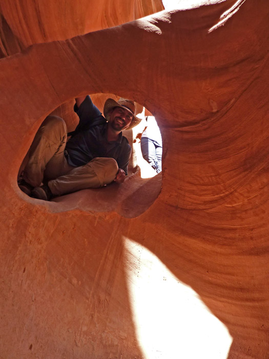 Wir folgten den gut sichtbaren Spuren zum hinteren Eingang des Peek a boo Canyons. Dieser ist zwar nicht ganz so eng, aber ebenfalls sehr schön. Am Ende kommt noch eine kleine Klettertour am Ausgang, die aber, gerade in diese Richtung, kein Problem darstellt.