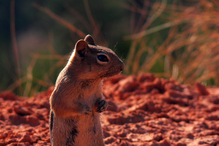 Am Campground angekommen bezogen wir unseren Platz und bereiteten uns auf unsere bisher herausfordernste Wanderung vor. Wir wollten zum Observation Point, gut 12 Kilometer Marsch inklusive ca. 650 Höhenmeter. Die Fahrt mit dem Shuttlebus verging schnell und wir stiegen mit zahlreichen anderen Leuten aus. Allerdings liefen alle anderen zum Weeping Rock, so dass wir uns alleine an die zahlreichen Serpentinen machten. Zuvor sahen wir jedoch noch diesen ausnehmend schönen Bewohner des Zion NP.