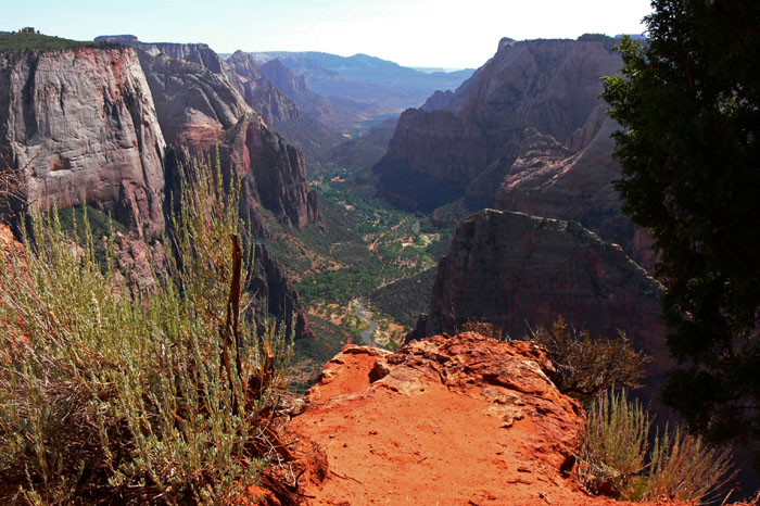Dadurch, dass wir schon einige anstrengende Wandertage in der Hitze hinter uns gebracht hatten, ging es besser als erwartet und schon bald bogen wir in den Echo Canyon ein, um dort eine etwas längere Pause einzulegen. Im letzten Drittel der Wanderung ging der Weg direkt an der Felswand entlang und auf der anderen Seite gähnte der Abgrund. Der Weg war zwar recht breit, dennoch war ich recht angespannt.  Als wir oben ankamen bot sich ein atemberaubender Ausblick. Der Aufstieg hatte sich wahrlich gelohnt.