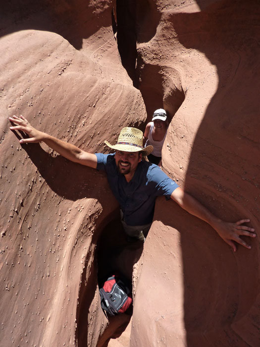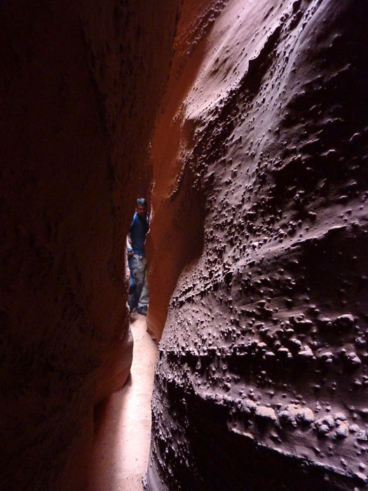 Beim Visitor Center sagte man uns, dass der Regen wohl weiter südlich deutlich stärker gewesen sei, bis zur Dry Fork, wo die Slots liegen, aber ein befahren möglich sein sollte. Auch die Gefahr für Flash Floods sei gering, aber wir sollten trotzdem auf Wetterumschwünge achten. Ok das hörte sich zumindest weitestgehend gut an, so dass wir uns auf den Weg machten. Die HitRR wurde nachdem wir den Abzweig zum gestern besuchten Devils Garden passiert hatten merklich schlechter und gerade zum Ende unserer Fahrt war es doch zweitweise recht ruppig. Auch der Abzweig zu Parkplatz hatte es in sich, so dass man eine Anfahrt eigentlich nur mit 4WD und vor allem High Clearance empfehlen kann. Auf dem Parkplatz beim Trailhead befand sich allerdings auch ein Minibus und ich staunte über das Fahrvermögen, den Mut und den Leichtsinn mancher Menschen. Wir packten uns ein wenig Verpflegung und ordentlich Wasser ein und machten uns an den Abstieg in die Dry Fork. Insgesamt war es deutlich stärker besucht als ich erwartet hatte, aber dort unten hat es sich dann gut aufgeteilt. Wir suchten nach dem Eingang des Peek a boo, da wir diesen zuerst machen wollten. Dort am Eingang trafen wir ein amerikanisches Ehepaar, welches auf ihren Sohn wartete. Der Vater war wohl mit diesem den Roundtrip Peek a boo-Spooky gelaufen, den wir auch machen wollten. Der Sohn wollte die Tour aber noch mal in die andere Richtung machen. Der Vater empfahl uns mit dem Spooky zu beginnen, da es in diese Richtung wohl einfacher wäre. Wir folgten seinem Rat und suchten den Eingang zum Spooky. Gedanklich fragte ich mich, ob der Spooky doch nicht so schmal sei, wie es die Bilder vermuten ließen, da der Herr doch einiges an Leibesfülle zu bieten hatte.