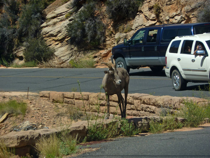 Anschließend genossen wir die Dusche, die uns ja gestern Abend verwehrt geblieben war, und machten uns auf dem Weg in den Zion NP. Dort verzichteten wir auf die ursprünglich geplante Wanderung zum Canyon Overlook, da wir durch die Verschiebung der Wanderung im Bryce Canyon NP später ankamen als ursprünglich geplant und machten uns gleich auf den Weg zum Watchman Campground.  Auf dem Weg gab es durch diesen Fußgänger noch einen etwas längeren Stau.