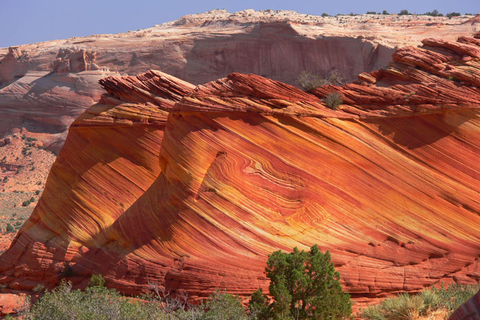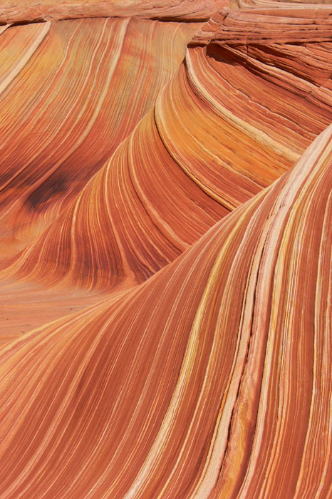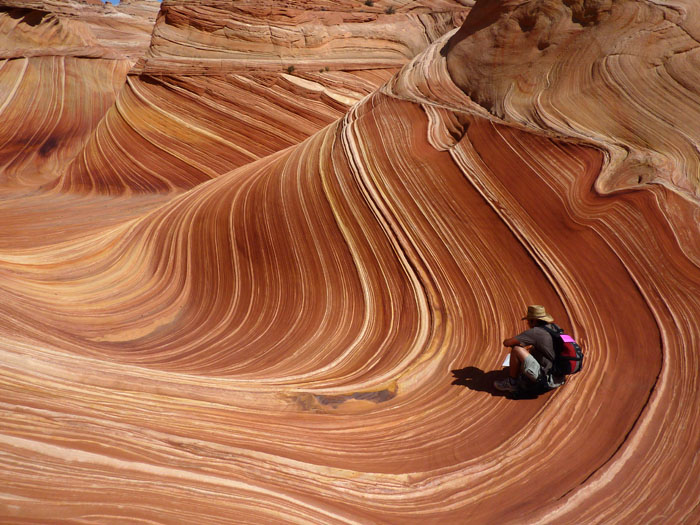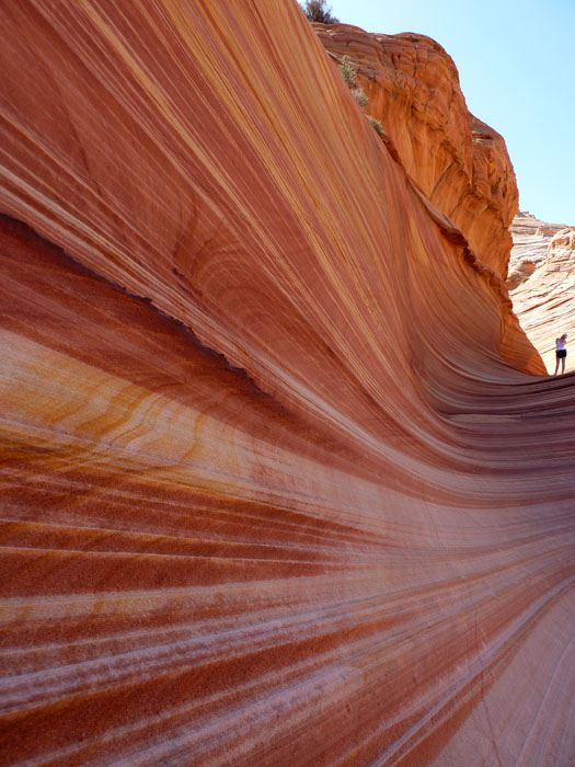 Als wir zur Wave kamen, waren fast alle anderen Permitbesitzer schon da. Lediglich ein Pärchen Amerikaner war noch hinter uns auf dem Weg. Die meisten anderen Besucher tummelten sich schon auf der Ebene oberhalb der Wave, so dass wir fast alleine herumstreifen konnten. Lediglich eine Asiatin saß im Schatten und hörte Musik über einen iPod. Ansonsten schien sie die Wave nicht im Entferntesten so zu beeindrucken wie uns. Dafür war ihr Begleiter umso begeisterter, da er offensichtlich jeden Quadratzentimeter fotografierte.
