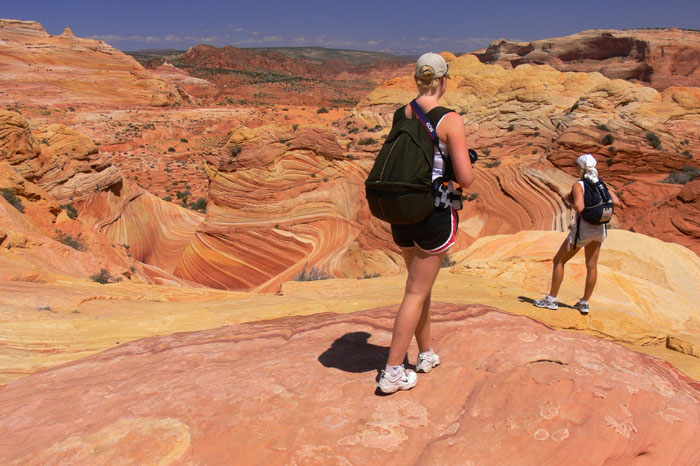Vermutlich haben wir aus Versehen die 5-Mile-Mountain-Road genommen. Nun ja. Jetzt ging es wieder gut voran, da die Straßenverhältnisse hier deutlich besser waren. Am Trailhead angekommen sahen wir schon einige Autos dort stehen. Wir rüsteten uns mit so viel Wasser aus wie wir tragen konnten. Rucksäcke, Seitentaschen in den Hosen und auch die Hände waren am Anfang voll, da wir vorhatten, den ganzen Tag an der Wave und in der Umgebung zu verbringen. Bei der Planung für die Wanderung im Umkreis der Wave habe ich mich an den Beschreibungen von Steffen Synnatschke und Fritz Zehrer orientiert.