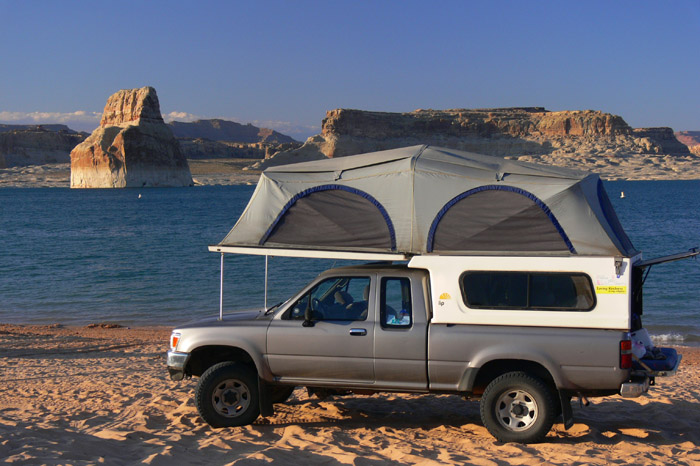 Der Weg zurück ging schneller als gedacht, aber man merkte, dass man ordentlich was getan hatte. Daher kamen wir auch nicht mehr auf die Idee zum Toadstool Hoodoo zu wandern, sondern machten uns gleich auf den Weg zum Lone Rock Beach in der Glen Canyon National Recreation Area. Dort kann man direkt am Strand campen und das Wasser des Lake Powell erschien uns jetzt einfach zu verlockend.
