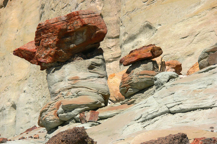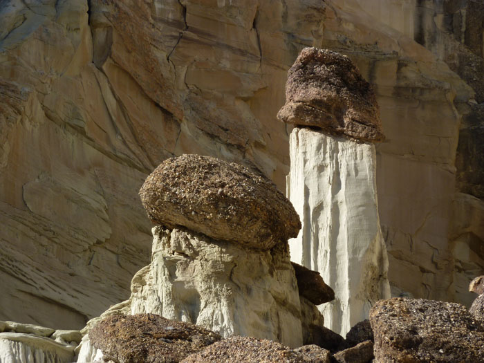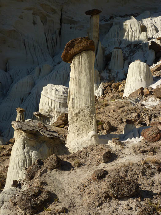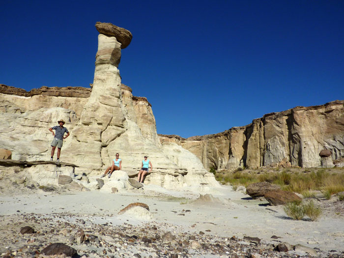 Die Wanderung zu den Hoodoos selbst ist nicht sonderlich spektakulär. Man folgt einfach einem trockenen Flussbett, doch ich brachte unfreiwillig etwas Spannung hinein. Nachdem wir bereits ein kleines Stück gegangen waren zeigte mir mein GPS-Gerät an, dass wir bereits an den Hoodoos vorbeigelaufen waren. Ich wunderte mich etwas, doch leitete die beiden Mädels zu dem vom GPS gezeigten Punkt zurück. Dort angekommen der Schock: keine Hoodoos zu sehen. Zwar einiges von dem typisch weißem Material, doch auch eine Abbruchkante und ein Schuttberg. Waren die Hoodoos Opfer der Naturgewalten geworden? Ich hatte nichts darüber gelesen und machte zur Sicherheit ein paar Fotos.