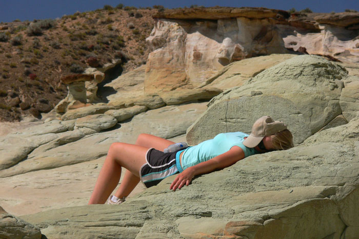 Nachdem wir die Hoodoos ausgiebig betrachtet und genügend Fotos geschossen hatten, gingen wir zurück zu Gray Jay. Wir fuhren die BLM 431 ein Stück zurück und bogen dann zum Sidestep Canyon ab. Vorm „Parkplatz war es nur ein kurzer Fußmarsch bis wir den Canyon sahen. Dort suchten wir uns einen sicheren Abstieg und tauchten in die Hoodoomenge ein. Die Müdigkeit der Mädels obsiegte über die Begeisterung zu den Hoodoos, so dass ich bald alleine umherstreifte, während sie selbst sich als umgestürzte Hoodoos zu tarnen versuchten.