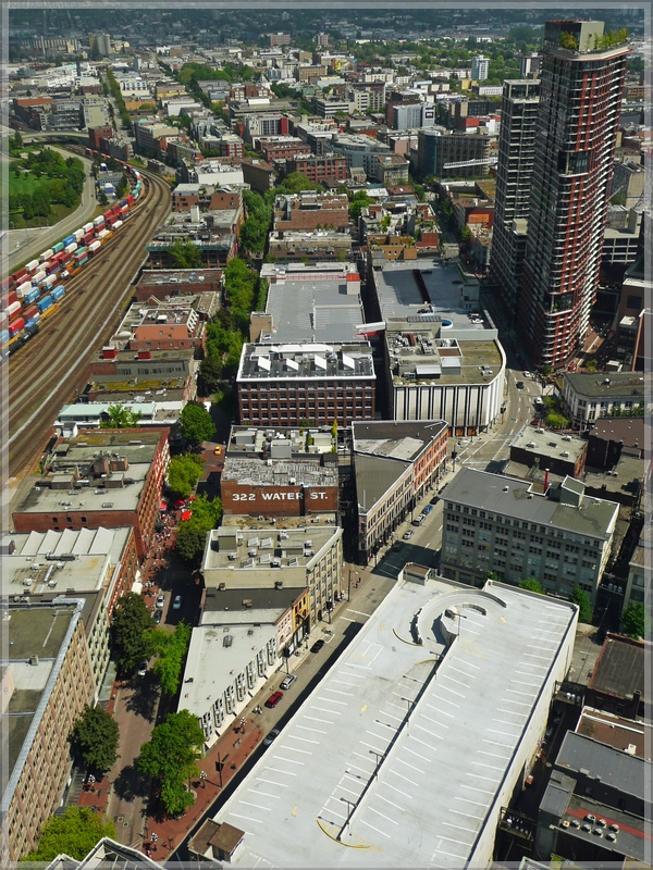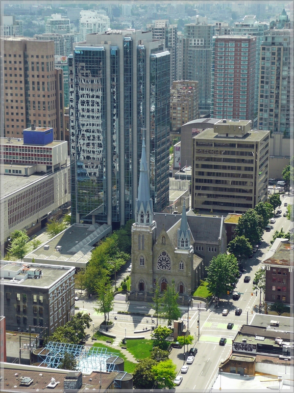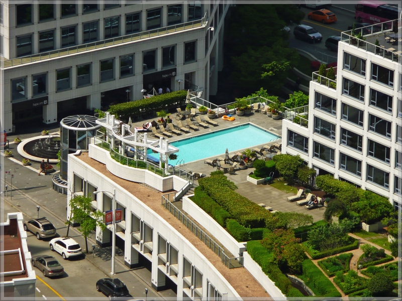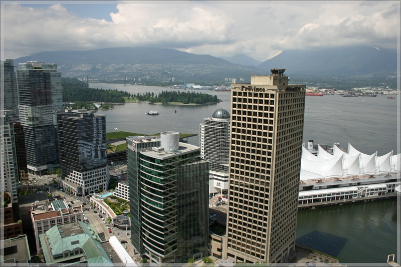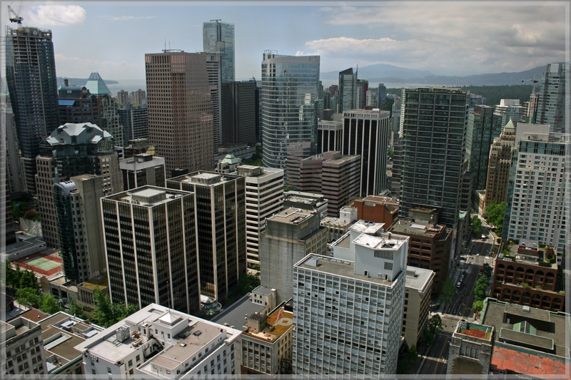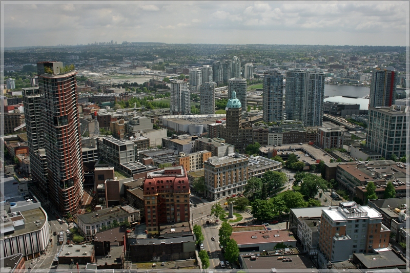 Über die Granville Street laufen wir zurück zum Hotel, um uns kurz etwas luftiger anzuziehen. Denn langsam hat die Sonne sich immer mehr durchgesetzt und es ist richtig warm. Es ist 14 Uhr als wir im Glasaufzug zum "Vancouver Lookout" hochfahren.
