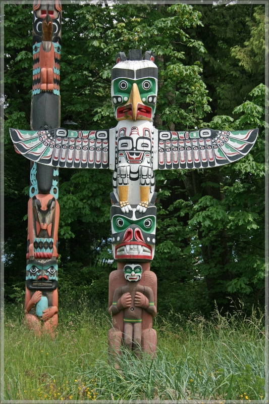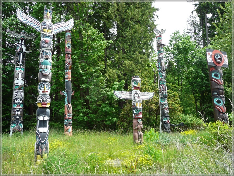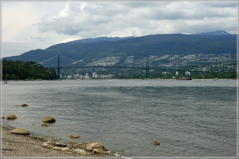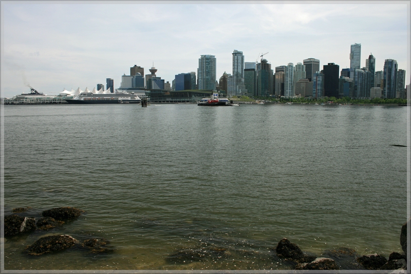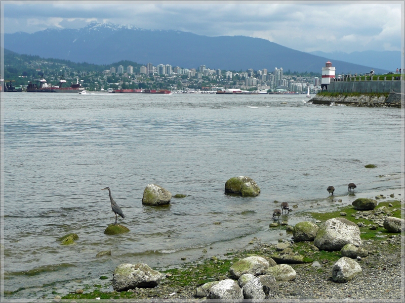 Heute ist noch mal ein Stück wärmer als gestern. Nachdem wir unsere Sachen gepackt und Kaffee getrunken haben checken wir um halb zwölf aus. Beim Starbucks gegenüber schauen wir im Internet, ob sich an den Flugzeiten etwas geändert hat und spazieren dann entlang der Waterfront zum Stanley Park. Dieser über 400 Hektar große Park ist der drittgrößte Stadtpark Nordamerikas und wird von einem 200 Kilometer langen Netz von Spazierwegen durchzogen. Mit dem Auto kann man ihn auf einer knapp 9 Kilometer langen Einbahnstrasse umrunden. Nach dem Besuch der Totem Pole-Sammlung lassen wir uns auf einer Parkbank nieder und genießen einfach den traumhaften Blick auf Burrard Inlet und Lions Gate Bridge.